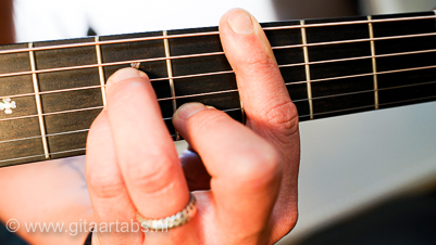 e snaar - 3 vinger op derde fret (dunste snaar)