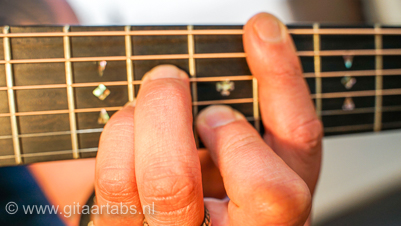 e snaar - 6 vinger op zesde fret (dunste snaar)