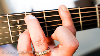 E snaar - 2 vinger op tweede fret (dikste snaar)